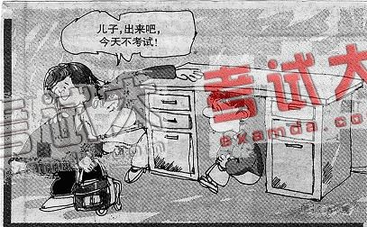 Testing students by examinations has long been regarded as a reliable way to assess students’ competence. But disproportionate emphasis on examinations has brought about terrible results. As is depicted in the picture, a schoolboy, frightened to death by examinations, huddles himself up under a desk, refusing to go to school. His parents are trying to comfort him, saying “Come out, there are no examinations today.”