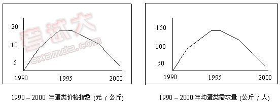 正如上面两张曲线图所示,从1990年到1995年蛋类的平均价格不断上升,并且其需求量也相应增加。曲线图还表明,从1995年到2000年期间蛋类价格下降,而且需求量也下降。这种现象是很奇怪的并值得研究。根据市场经济法则,需求量增加会引起价格上涨。也就是说,当价格上升时,需求就下降,而当价格回落时,需求就增加。但是现在的现实恰好相反。