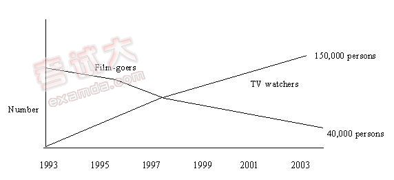 A recent survey analyzed the change in the number of film-goers and TV watchers in X city. As is shown by the graph, during the period from 1993 to 2003 there has been a sharp decline in the number of film-goers, adding up to 40,000 persons in 2003. On the other hand, the number of TV watchers has steadily increased in the last decade, reaching 150,000 in 2003. Finally, it is interesting to note that there were as many film-goers as TV watchers in the year 1997.