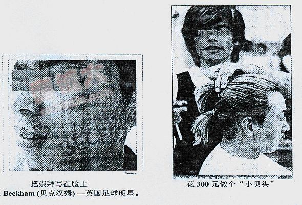 What vivid pictures! One presents a young man’s face, on which the name Beckham is painted, and the other depicts an equally disturbing situation, where a teenager spends 300 yuan on his haircut simply because he wants to follow Beckham’s hairstyle. Obviously, the drawer intends to remind us how crazily these youngsters are adoring their icons.