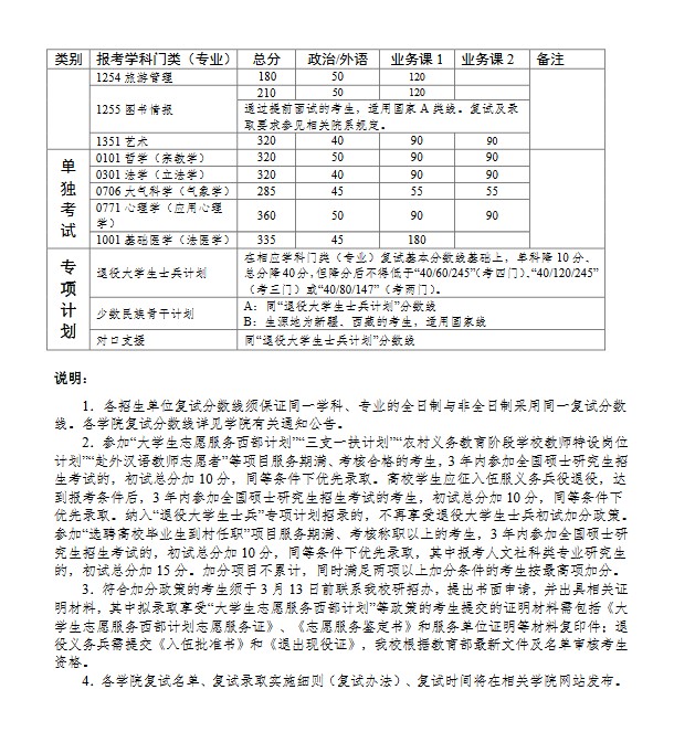 各位考生: 现将我校2019年硕士研究生入学考试复试基本分数线及相关安排通知如下: 一、复试基本分数线 1.学术型硕士研究生 学科门类(专业) 政治 外语 业务 ...