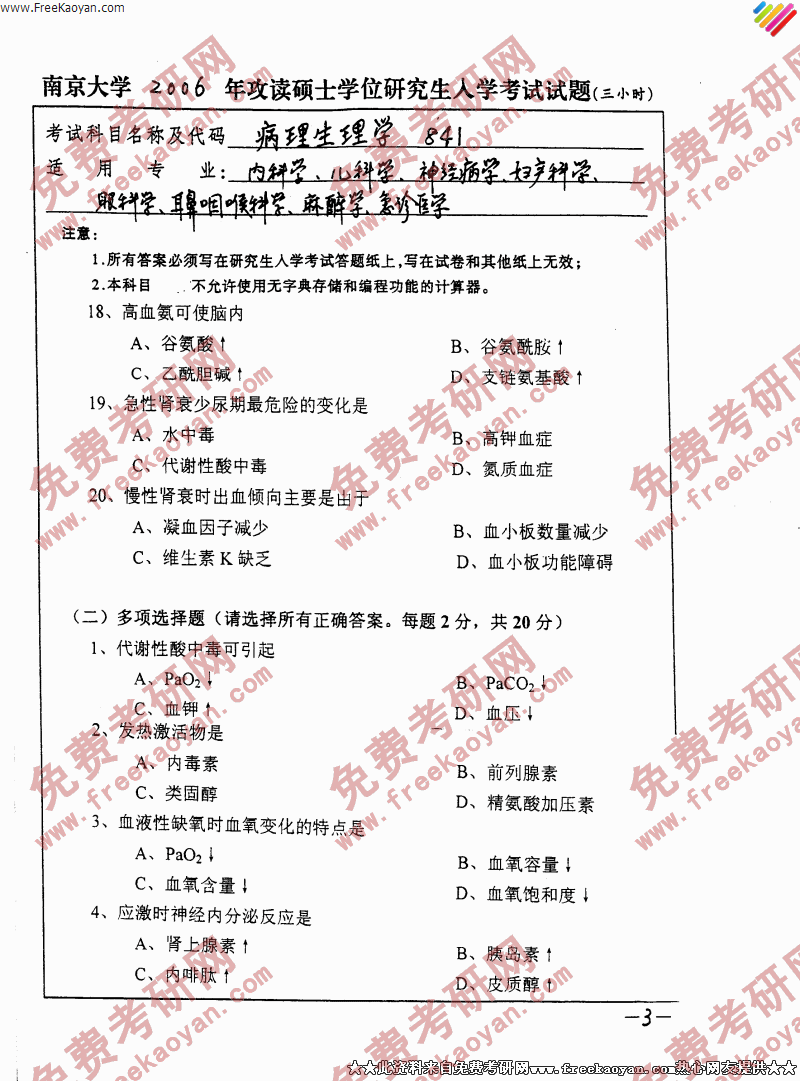 南京大学2006年半岛在线注册真题-病理生理学(内科学,儿科学,神经病学,妇产科学,眼科学,耳鼻咽喉科学,麻醉学,急趁医学)(3)