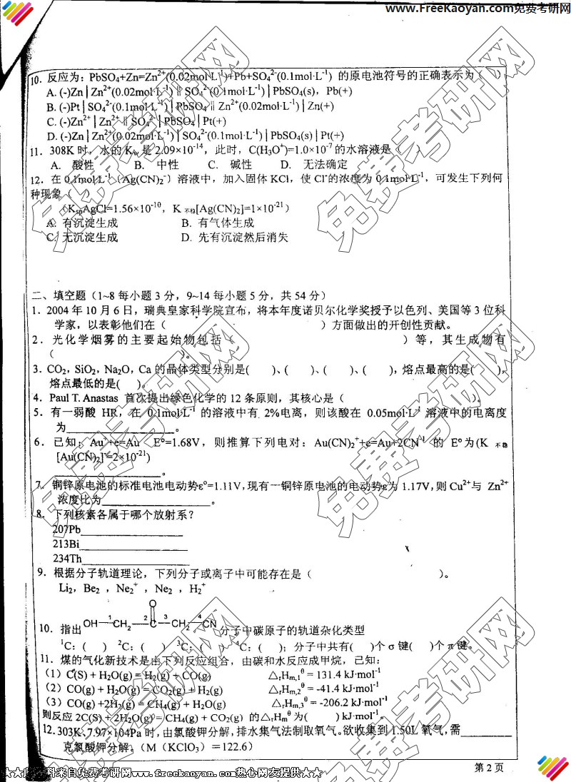 华东师范大学2005年半岛在线注册真题-普通化学原理(2)