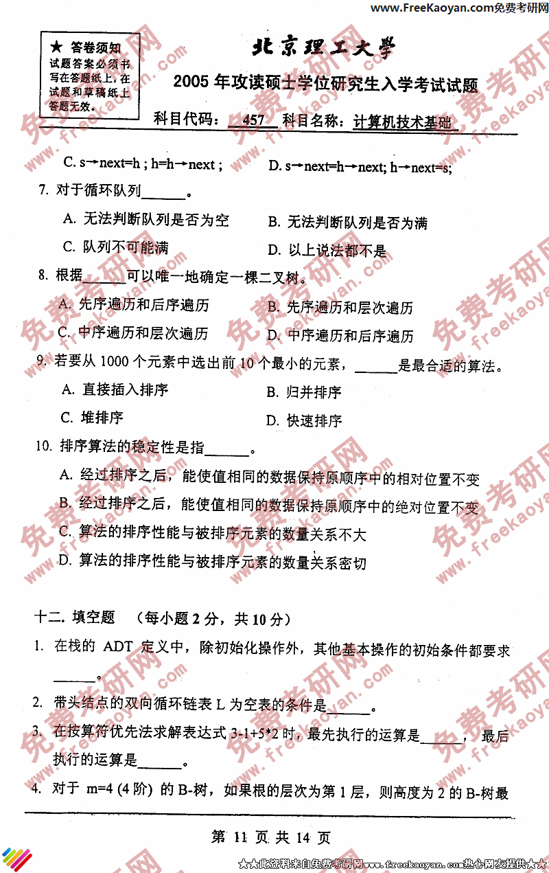 北京理工大学2005年半岛在线注册真题-计算机技术基础(含计算机组成原理、操作系统和数据结构)(11)