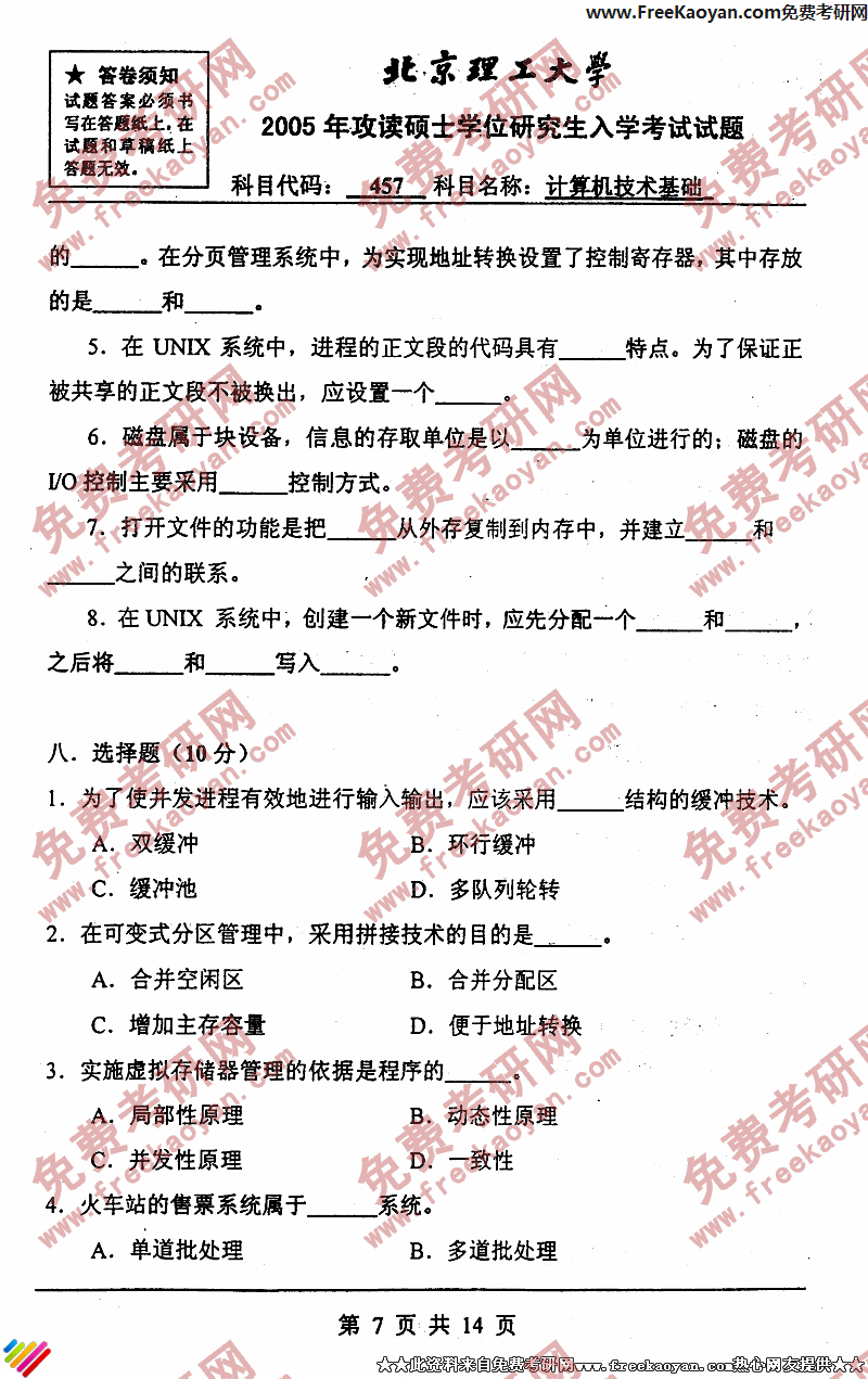 北京理工大学2005年半岛在线注册真题-计算机技术基础(含计算机组成原理、操作系统和数据结构)(7)