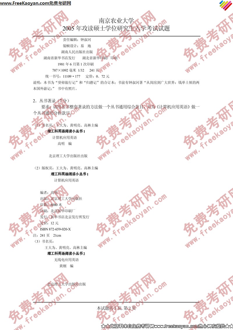 南京农业大学2005年半岛在线注册真题-文献分类编目(2)