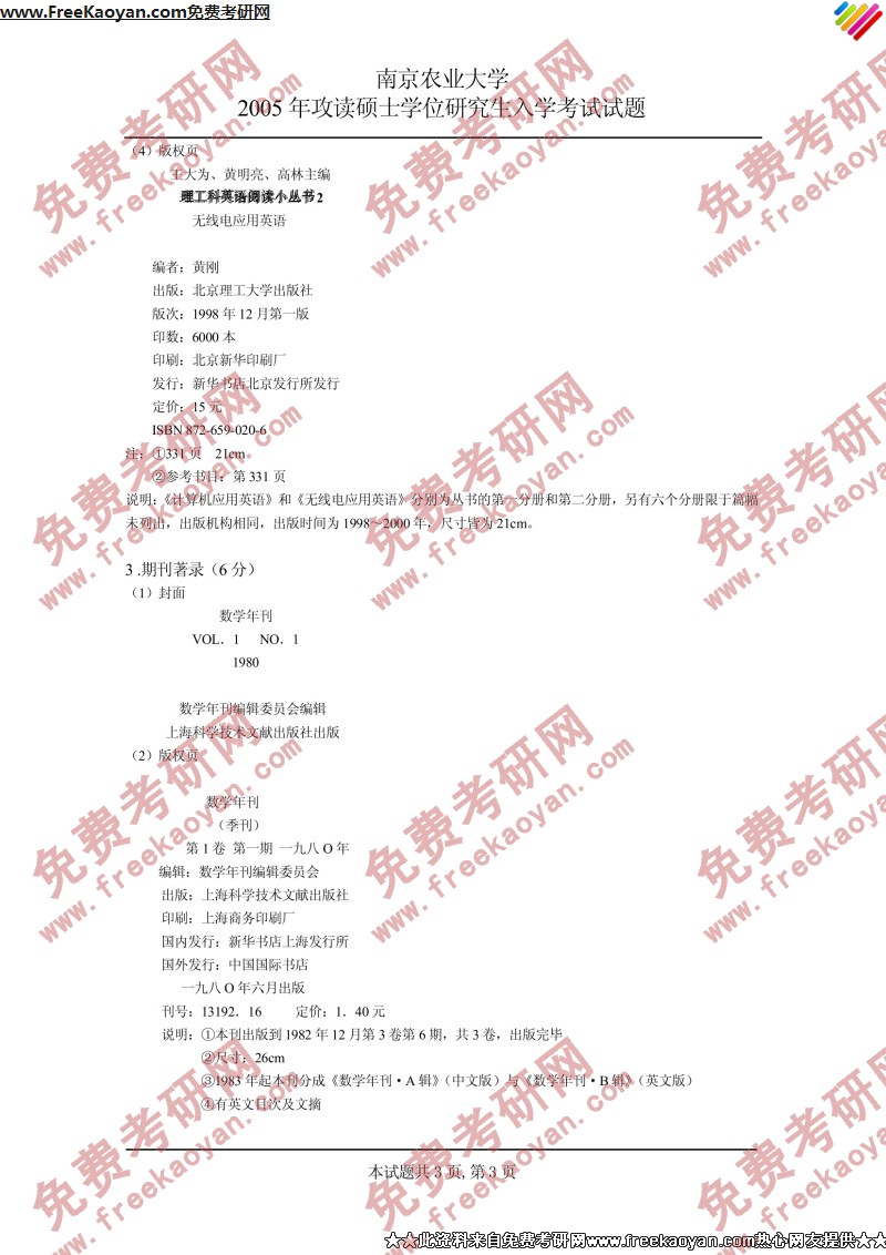南京农业大学2005年半岛在线注册真题-文献分类编目(3)