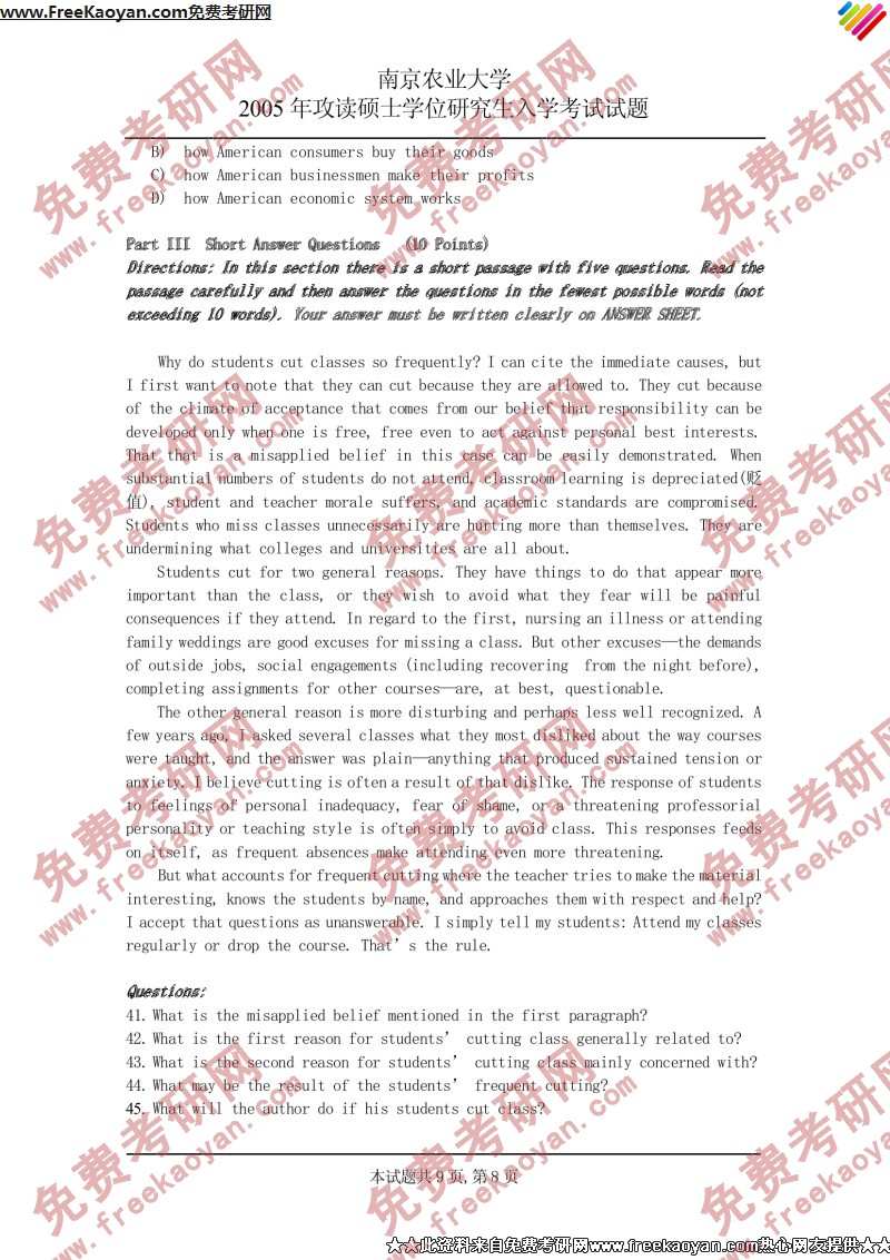 专业课半岛在线注册经验 本站小编 FreeKaoyan 2018-01-23南京农业大学2005年半岛在线注册真题-英语(单)