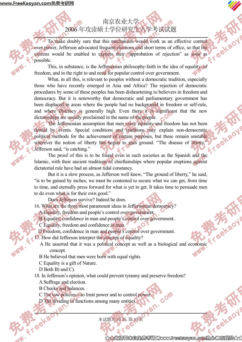 南京农业大学2006年半岛在线注册真题-基础英语(10)