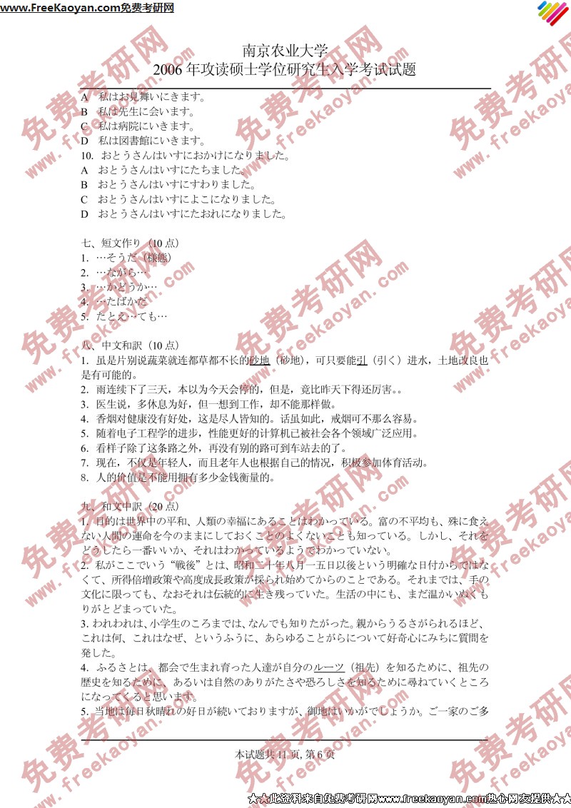专业课半岛在线注册经验 本站小编 FreeKaoyan 2018-01-23南京农业大学2006年半岛在线注册真题-日语读解与写作