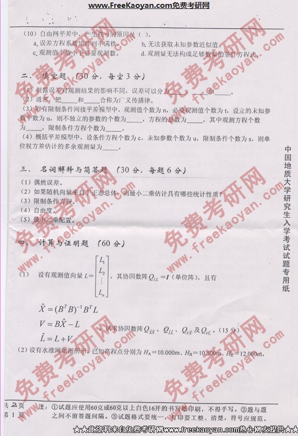 中国地质大学(武汉)2005年半岛在线注册真题-测量平差(2)