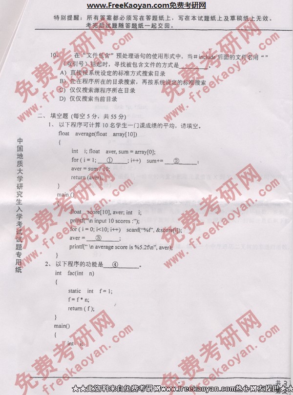 专业课半岛在线注册经验 本站小编 FreeKaoyan 2018-01-23中国地质大学(武汉)2005年半岛在线注册真题-C语言(资源)