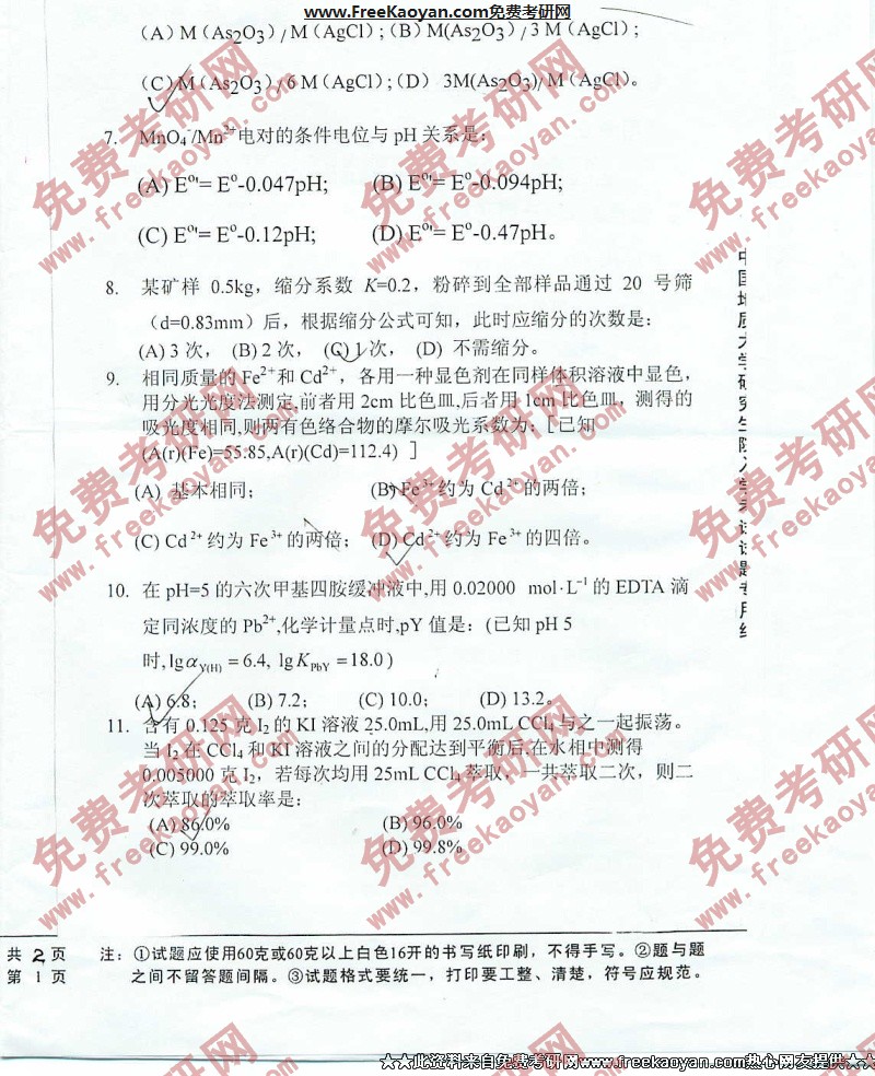 中国地质大学(武汉)2006年半岛在线注册真题-分析化学(2)