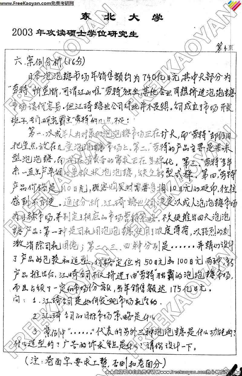 武汉理工大学2003年市场营销与生产管理复试试卷复试科目:市场营销与生产管理 复试专业:企业管理 姓名: 准考证号: 成绩:一、简述题(从中选做2题,每题30分,共60分)。1、一般来讲,市场上畅销的产品都是物美价廉的产品,请问物美价廉的产品在市场上就一定畅销吗?为什么?2、有一位管理学大师曾说过: ...