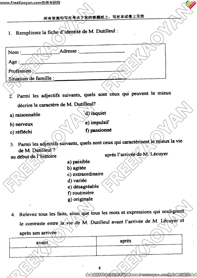 上海外国语大学2005年半岛在线注册真题-综合考试(法语语言文学)(8)