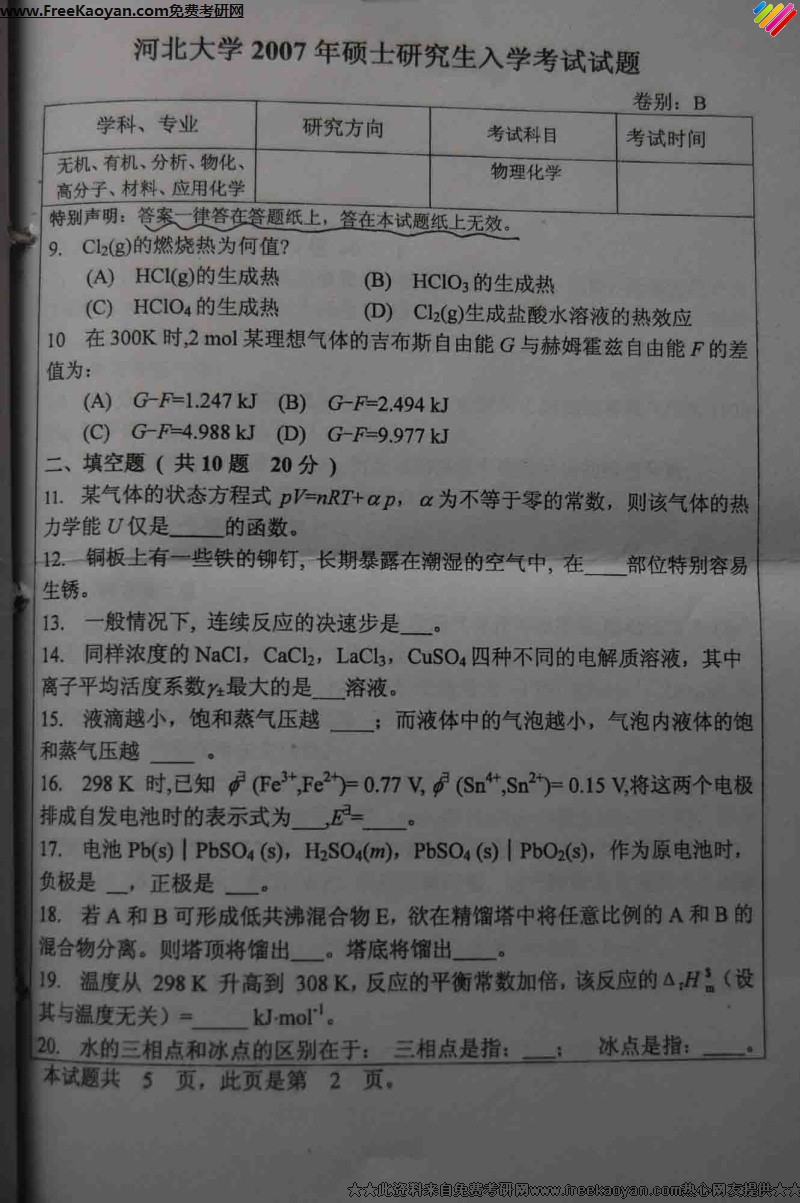 河北大学2007年半岛在线注册真题-物理化学(2)