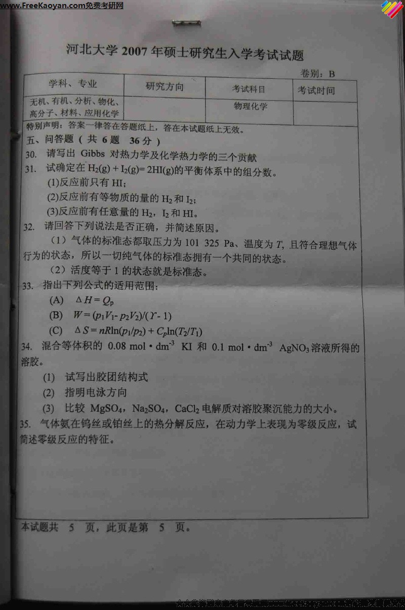 河北大学2007年半岛在线注册真题-物理化学(5)
