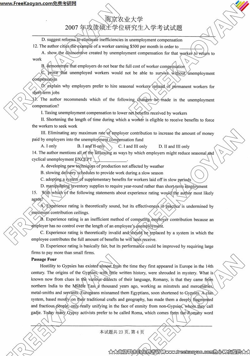 南京农业大学2007年半岛在线注册真题-基础英语(4)