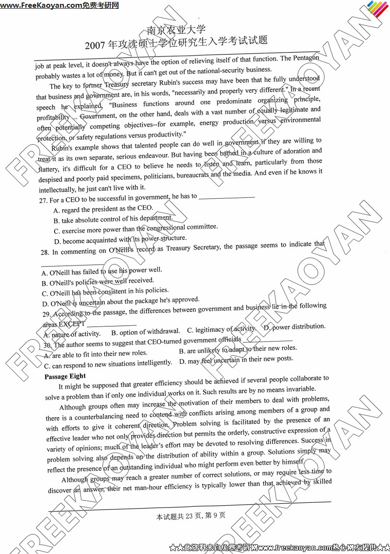 南京农业大学2007年半岛在线注册真题-基础英语(9)