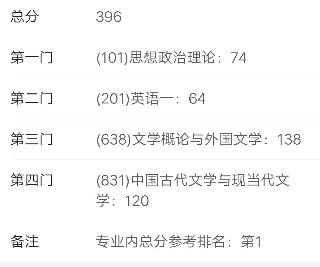 我考的是比较文学方向,在9月份出大纲之前都没有复习过古代文学和现当代的书籍(因为之前不考),最终初试结果出来,专业一138分,专业二120分。专业二确实考的不好,但鉴于自己把古代文学的一道20分的大题完全答错了(那道题是让你评价“一从二令三人木,哭向金陵事更哀”这句判词所指的人物,古代废的我完全评价错了人。。),所以刨去那20分,整张试卷别的部分其实只减了10分,绝对出乎我的意料。不过我想,这应该也和正确的学习方法和有效的资料利用分不开。