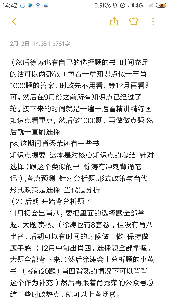 11月初会出肖八,要把里面的选择题全部掌握,大题读熟。(徐涛也有8套卷 ,但没有肖八出名,后期可以有时间的时候做一做 保持做题手感 )12月中旬出肖四,选择题全部掌握,大题全部背下来.(然后徐涛会出分析题的小黄书 (考前20题)肖四背熟的情况下可以背背这个作为补充 )然后再跟着肖秀荣的公众号总结一些时政热点,就可以上考场啦。