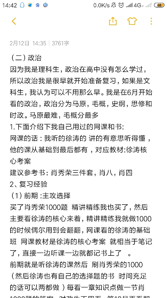 前期就是听徐涛的课然后 刷肖秀荣的1000 (然后徐涛也有自己的选择题的书 时间充足的话可以两都做 )每看一章知识点做一节肖1000题的答案,时政先不用看,等12月再看即可。然后在9月份之前所有知识点已经过了一轮。接下来的时间就是一遍一遍看精讲精练画知识点看重点,然后做1000题,再做做真题 然后就一直刷选择