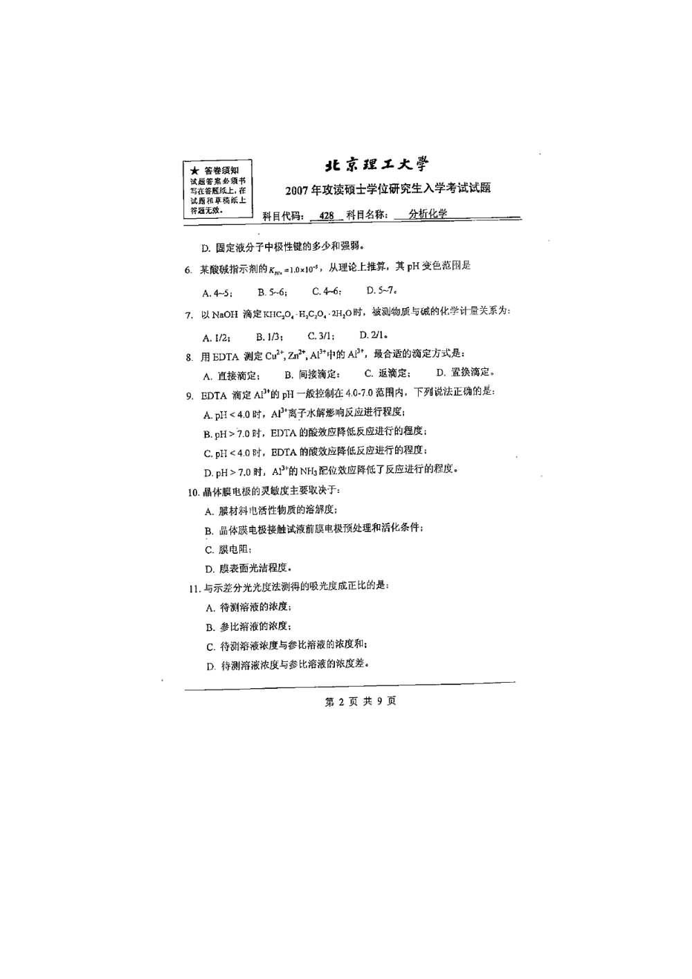 北京理工大学2007分析化学828半岛在线注册真题(2)