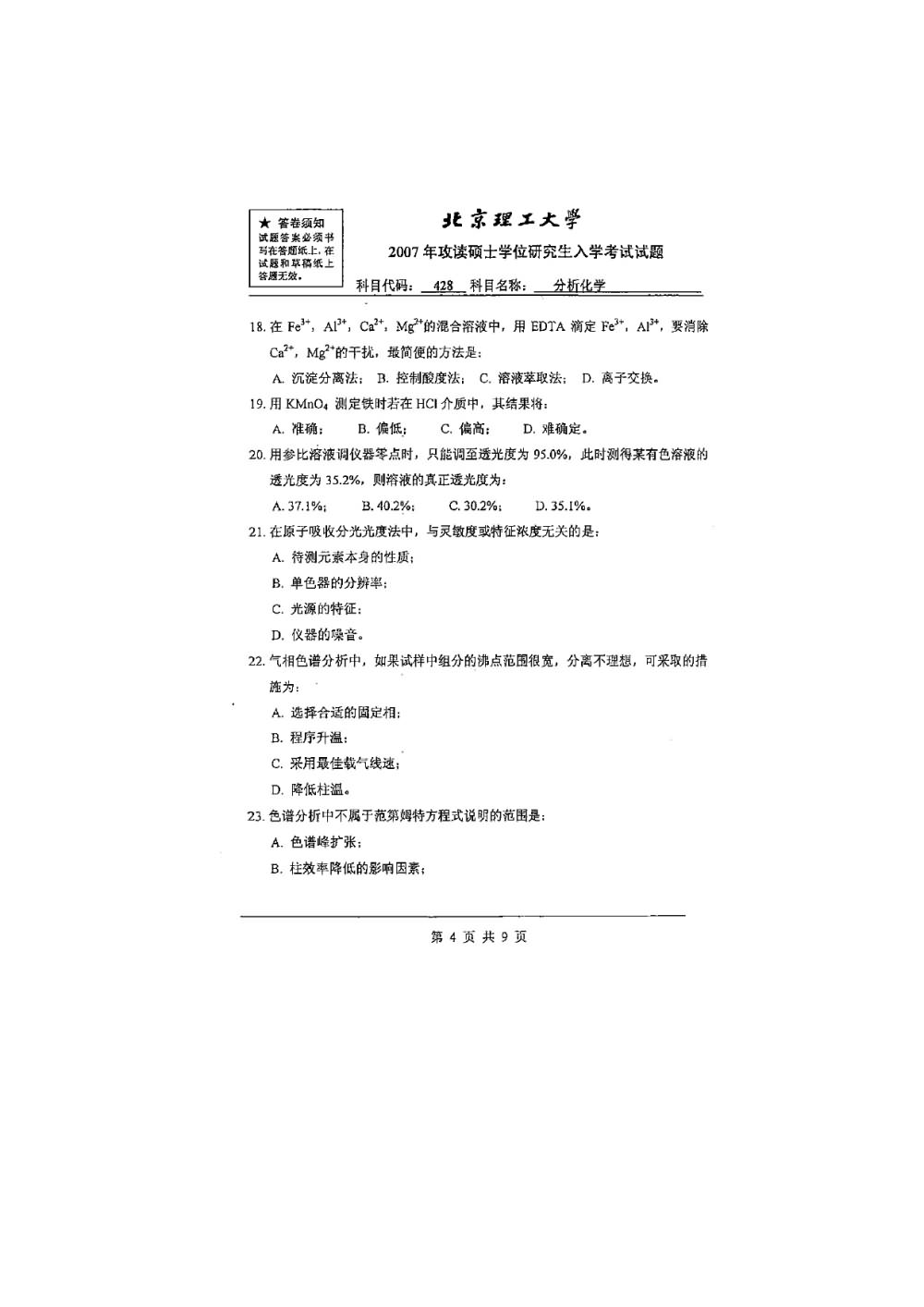 北京理工大学2007分析化学828半岛在线注册真题(4)