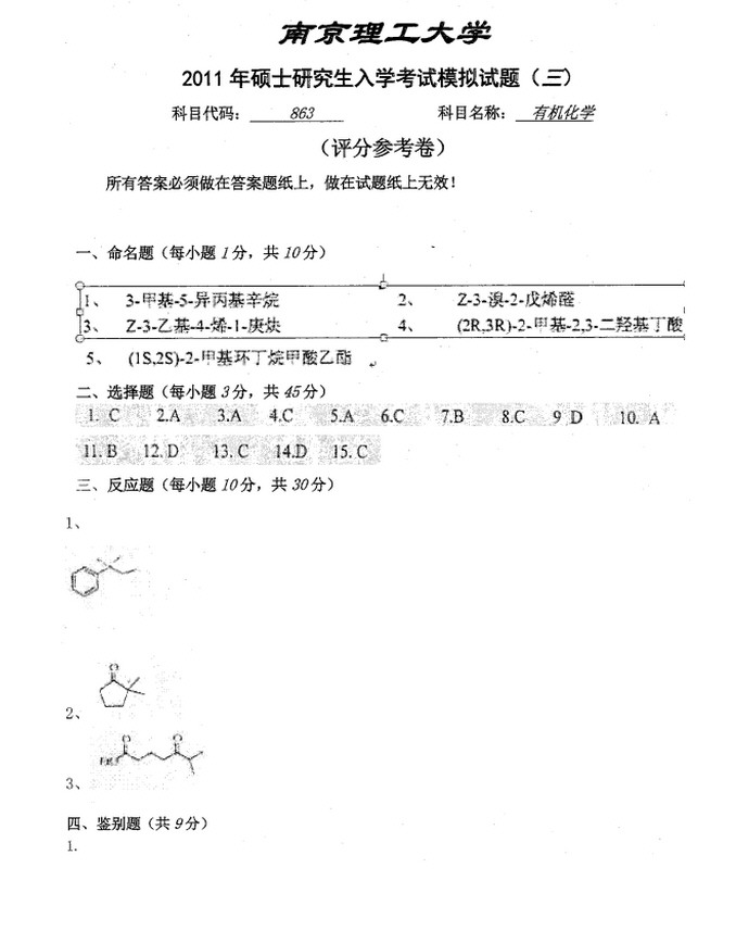 写在前面的话语: 本人2011年报考大连理工大学应用化学专业,初试专业课数学二和有机化学(885),很遗憾没有考上大工,后调剂,初试的有机化学感觉复习不好,于是在专业课有机化学考试的时候答完自己会做的题目后,将考试真题写在准考证背面,以供学弟学妹们参考。第一、二、三、四题太多了,实在记不下来,但是后面三道题 ...