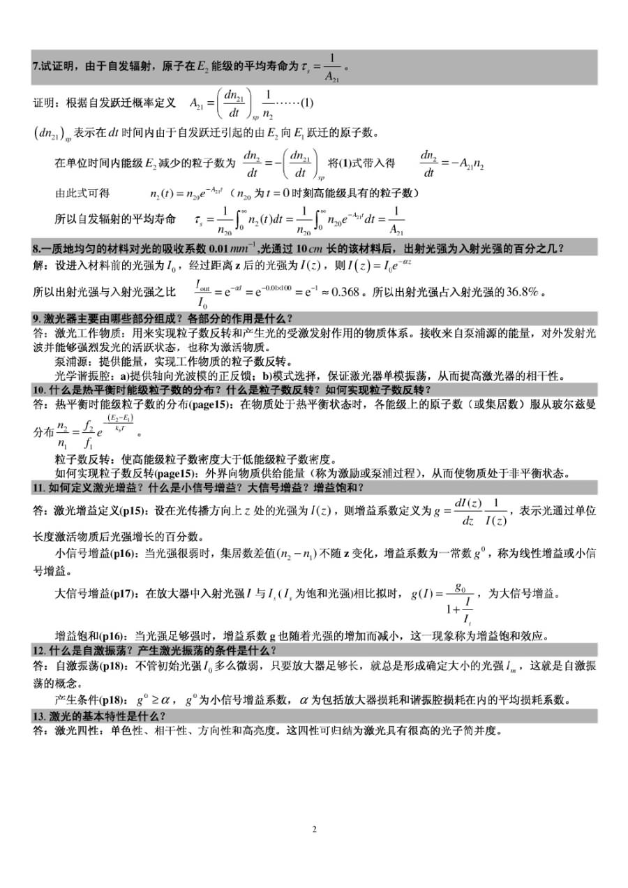 2015华中科技大学光学工程激光原理900真题回忆 一、简答题 1、△n 大于0,激光器是否能够产生自激振荡? 2、光学谐振腔的结构和作用 3、共焦腔与一般腔的等价性 4、均匀加宽与非均匀加宽的特点 5、连续激光器从开始振荡到产生稳定输出增益系数的变化情况 6、光学模式以及横模和纵模 二、三能级四能级的本质区别,以及 ...专业课半岛在线注册资料 本站小编 半岛在线注册 2015-12-17内蒙古大学激光原理与技术课后题