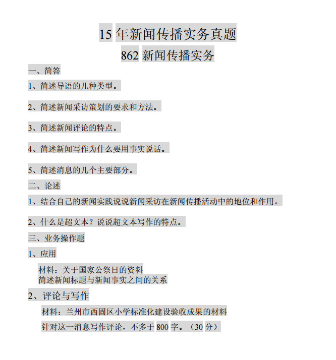 2016暨大新闻传播真题(完美版) 809新闻业务 一、名词解释 解释性报道 病毒式营销 媒介审判 调节类电视节目 跨屏互动 DMC 二、简答 1. 简述新闻报道中引语的使用规范 2. 简述新媒体环境中,如何拟定优秀的新闻标题 3. 结合必要的文本案例,简述调查性报道采访和写作特点 4. 简述电视节目编辑的基本原则 5. 简述系列广 ...