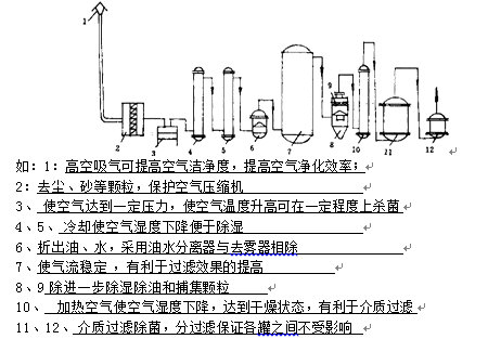 高空吸气口1→空气粗滤2→空压机3(0.2Mpa,120--150℃)→空气冷却器4、5(冷却至20--25℃)→分水器6--空气贮罐7→旋风分离器8→加热器10(至30--35℃)→总过滤器11→分过滤器12