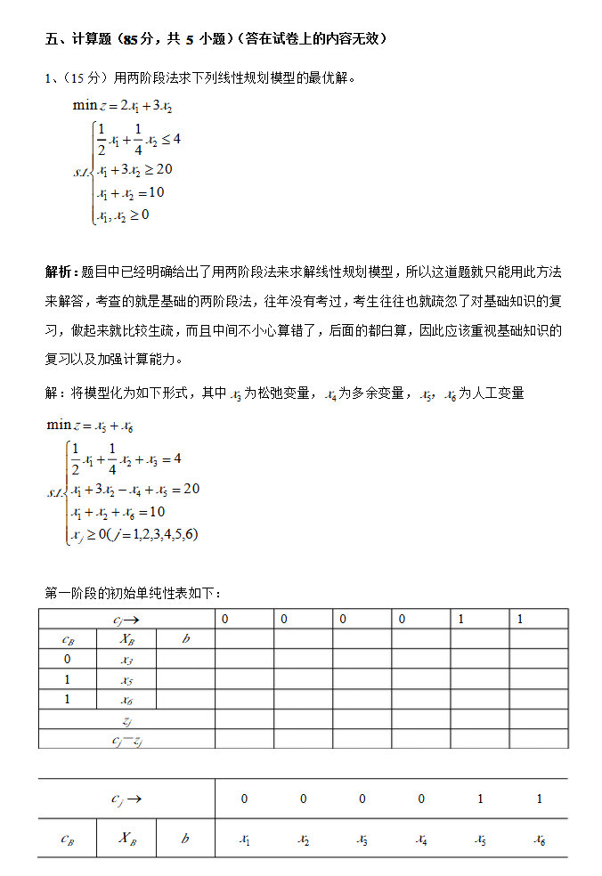 2015年北京交通大学管理运筹学半岛在线注册真题 一单纯形法求解,并且利用灵敏度分析计算,共计35分。 二运输问题,先列运输模型,再化为对偶问题的模型,之后再求解,还有一个小题是改了某个运价,问是否影响结果?可能是20分 三指派问题,非标准型的,大概是由四个任务,三个人,有两个人可以分别完成两个任务,第一题是化为标 ...专业课半岛在线注册资料 本站小编 网络资源 2015-07-13北理工管理运筹学半岛在线注册全年复习计划