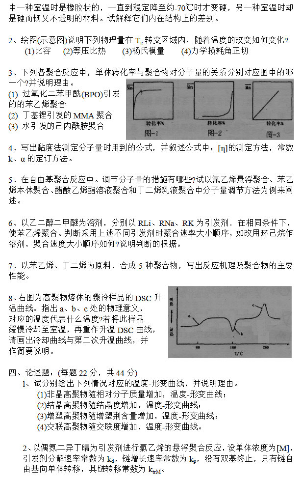 一、写出合成下列聚合物的反应式:(4分)1.聚酰胺662.聚乙烯酵缩甲醛3.聚氯乙烯 二、根据聚台物的结构,简要说明下列问题(选答4题)(36分)1.聚乙酸乙烯酯(PVA c)与聚乙烯醇(PVA)的结晶性差异2.聚四氟乙烯的耐溶剂性3.全同立构PP加热熔融后不能变成无规立构PP4.LDPE与HDPE的密度差异5.SBS是热塑性弹性体 三、两种单体进行共聚 ...