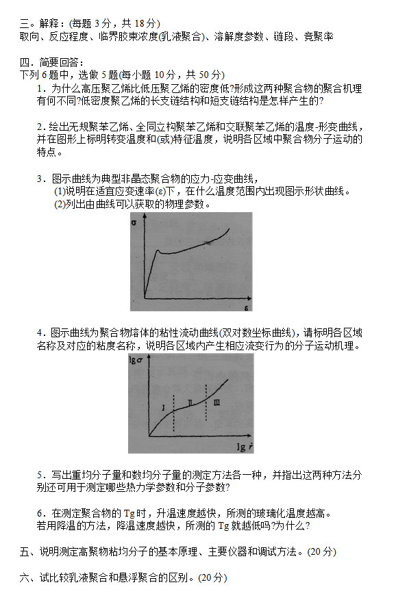 一、写出合成下列聚合物的反应式:(4分)1.聚酰胺662.聚乙烯酵缩甲醛3.聚氯乙烯 二、根据聚台物的结构,简要说明下列问题(选答4题)(36分)1.聚乙酸乙烯酯(PVA c)与聚乙烯醇(PVA)的结晶性差异2.聚四氟乙烯的耐溶剂性3.全同立构PP加热熔融后不能变成无规立构PP4.LDPE与HDPE的密度差异5.SBS是热塑性弹性体 三、两种单体进行共聚 ...
