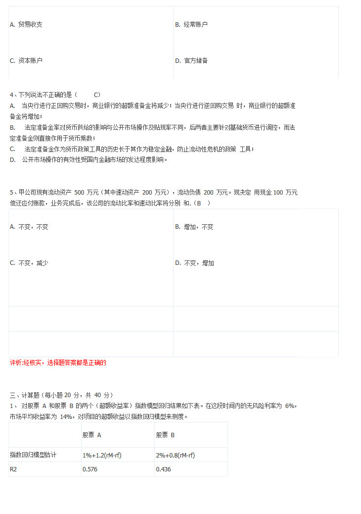 一、名词解释 1.格雷欣法则 2.金融衍生工具 3.丁伯根原则 4.国际储备 5.外债 6.有效资本市场 7.托宾Q 8.特别提款权 二、简答题 1.一般性货币政策原则及其传导机制 2.影响汇率变化的因素 3.利率期限结构理论 4.国际货币体系的内容及其演变 三、论述题 1.对金融创新的认识 ...