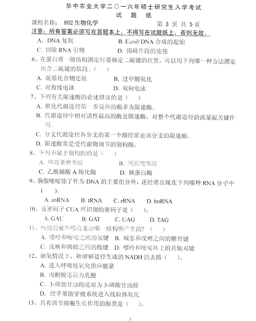华中农业大学2017年--2016年802生物化学半岛在线注册真题(8)