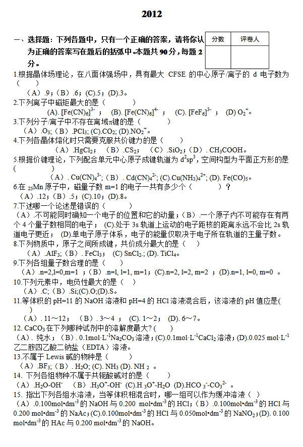郑州大学2013-2012无机化学半岛在线注册复试试题(12)
