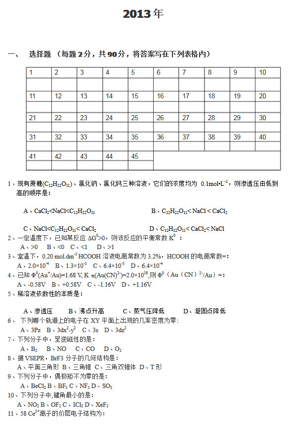郑州大学2013-2012无机化学半岛在线注册复试试题(7)