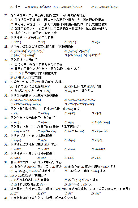 郑州大学2013-2012无机化学半岛在线注册复试试题(9)