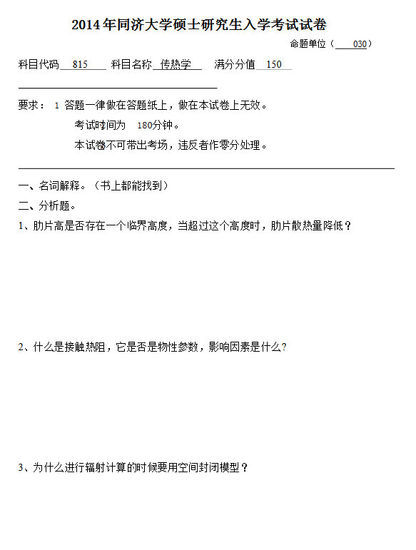2013,2014年同济大学815传热学半岛在线注册试题(6)
