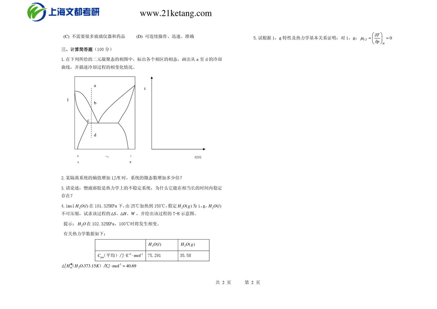 2012年东华大学622物理化学半岛在线注册模拟试题(2)