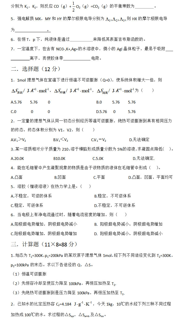 东南大学1998-2013年的(除了2010)物理化学半岛在线注册真题(29)