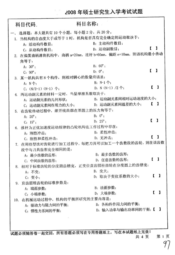 2008中国矿业大学机械原理专业课半岛在线注册真题