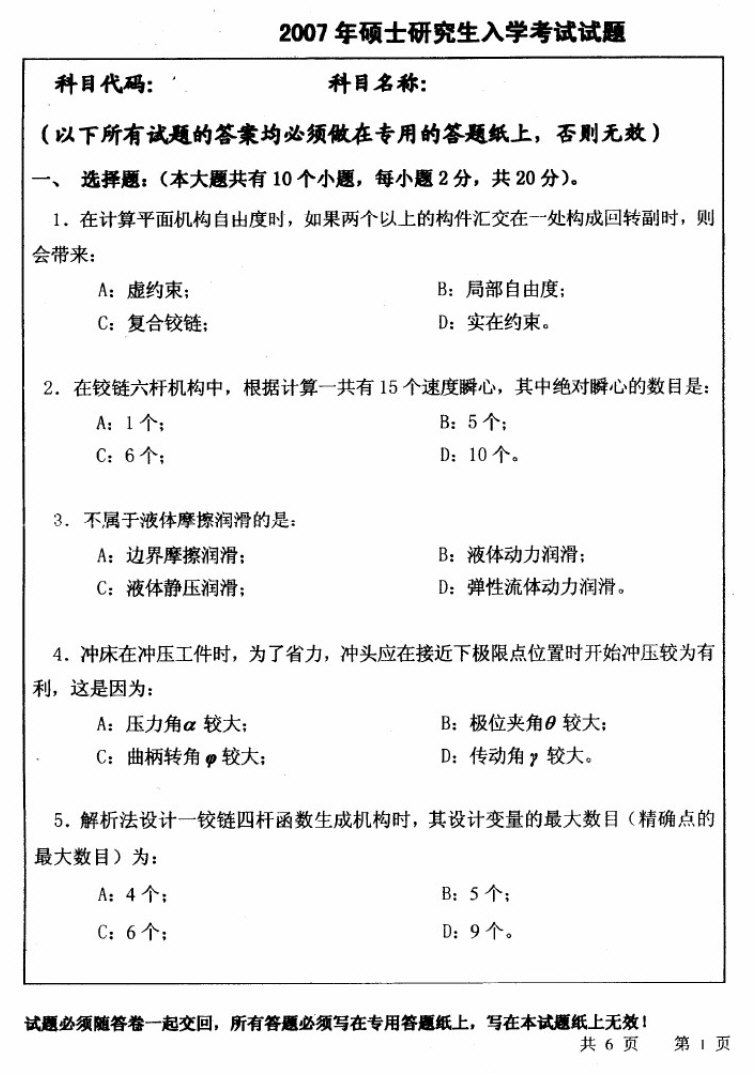 2007中国矿业大学机械原理专业课半岛在线注册真题