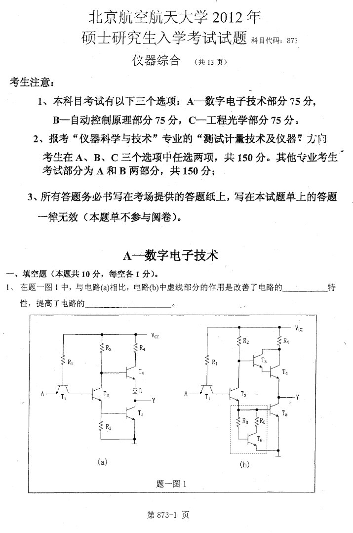 北京航空航天大学2012仪器综合873半岛在线注册真题