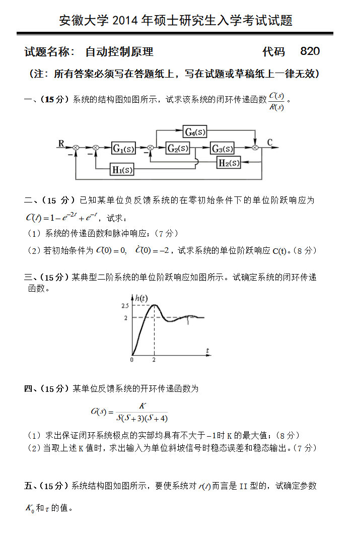 安徽大学2014年自动控制原理820半岛在线注册真题