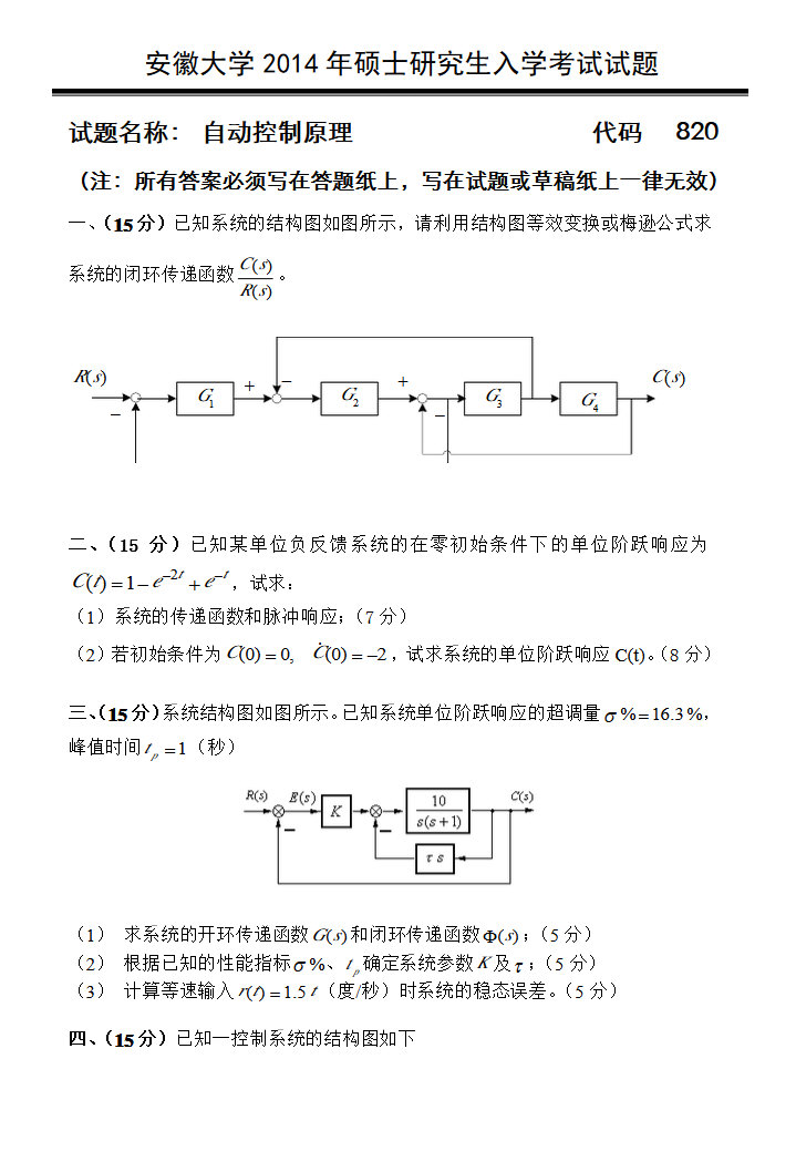 安徽大学2014年自动控制原理820半岛在线注册真题