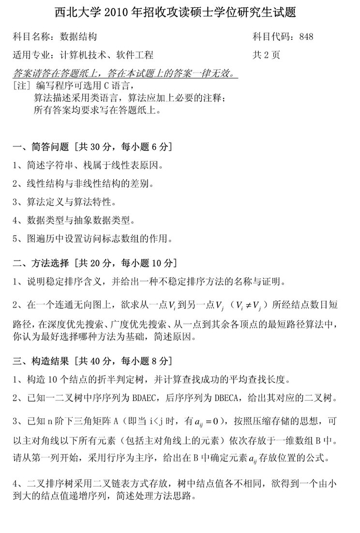 西北大学计算机专硕2015-2010历年半岛在线注册真题(数据结构,软件工程学科专业基础综合)(11)