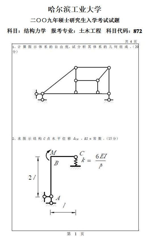 哈尔滨工业大学2009结构力学872半岛在线注册真题